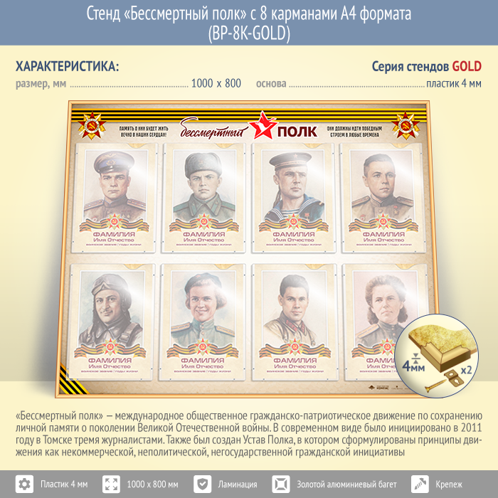 Стенд «Бессмертный полк» с 8 карманами А4 формата (BP-8K-GOLD)