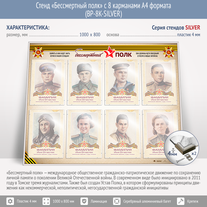 Стенд «Бессмертный полк» с 8 карманами А4 формата (BP-8K-SILVER)
