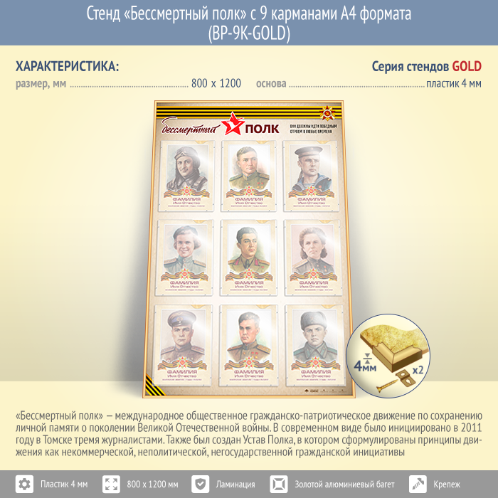 Стенд «Бессмертный полк» с 9 карманами А4 формата (BP-9K-GOLD)