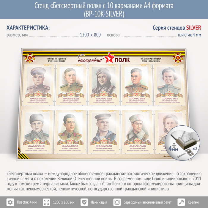 Стенд «Бессмертный полк» с 10 карманами А4 формата (BP-10K-SILVER)