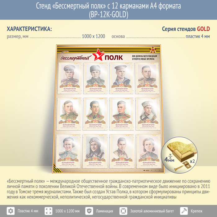 Стенд «Бессмертный полк» с 12 карманами А4 формата (BP-12K-GOLD)
