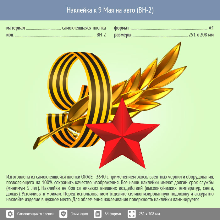 Наклейки к 9 Мая на авто А4 формата (BH-2) это замечательный способ выразить благодарность ветеранам ВОВ, знак памяти об их великом подвиге