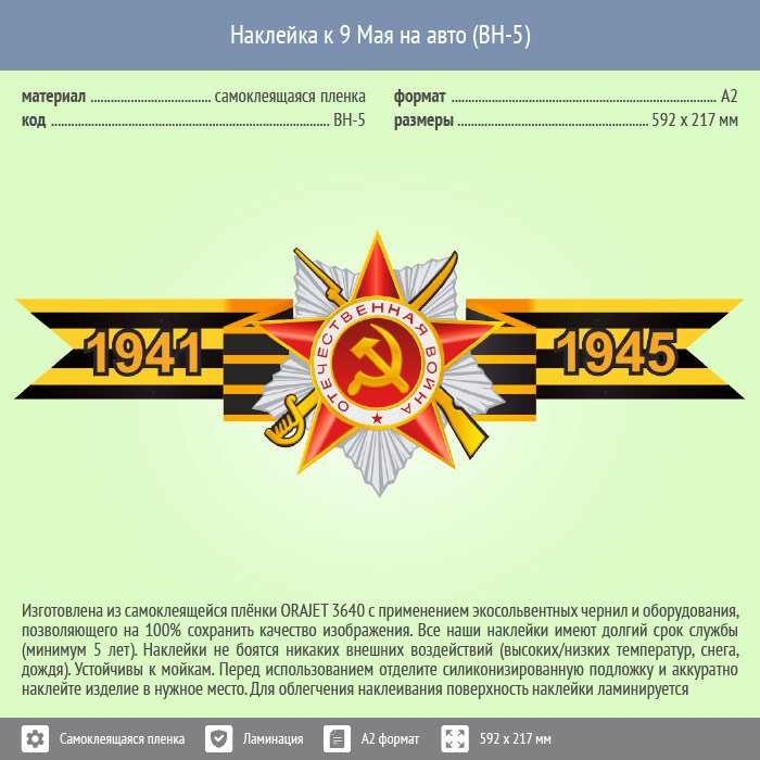 Наклейки к 9 Мая на авто А2 формата (BH-5) это замечательный способ выразить благодарность ветеранам ВОВ, знак памяти об их великом подвиге