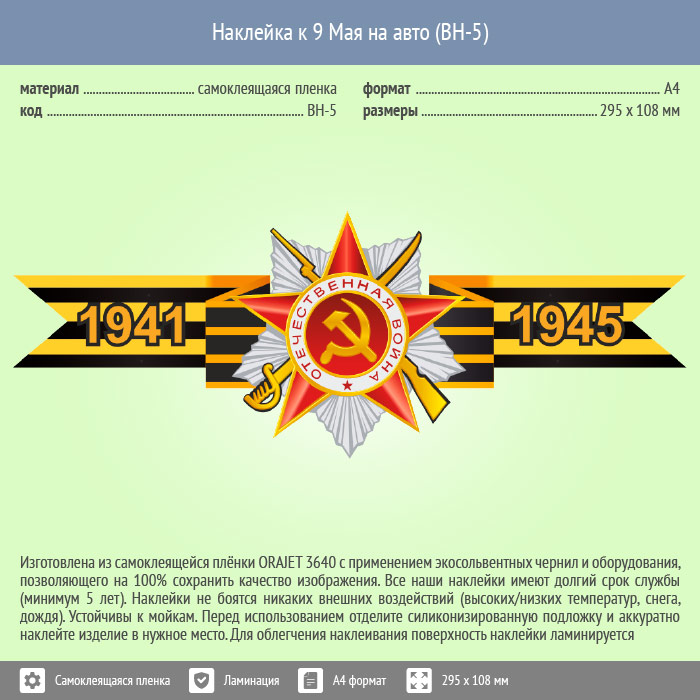 Наклейки к 9 Мая на авто А4 формата (BH-5) это замечательный способ выразить благодарность ветеранам ВОВ, знак памяти об их великом подвиге