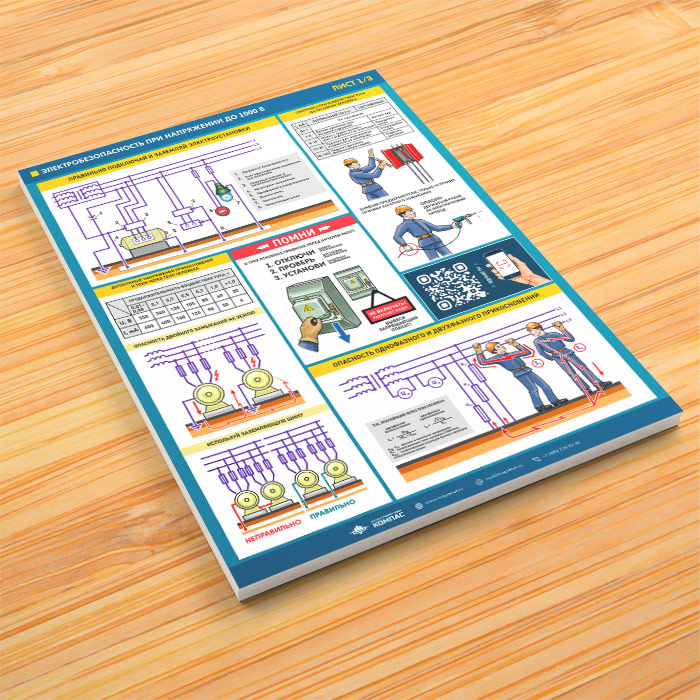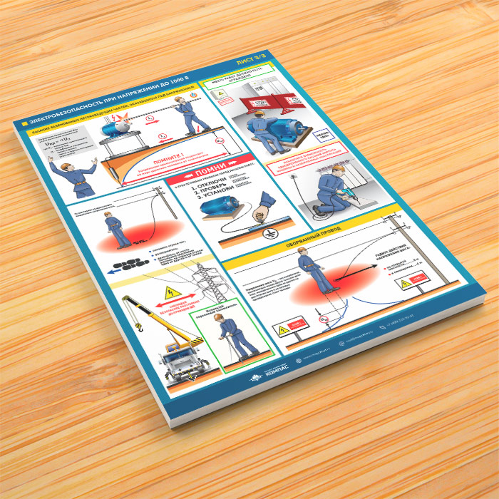 Комплект плакатов из 3-х листов «Электробезопасность при напряжении до 1000В» содержит основополагающую информацию о технике безопасности при работе с электричеством, напряжением до 1000В. Вы узнаете о правилах обращения с электричеством и электрооборудованием, защитных устройствах и воздействие тока на организм человека, правилах заземлении и прочем