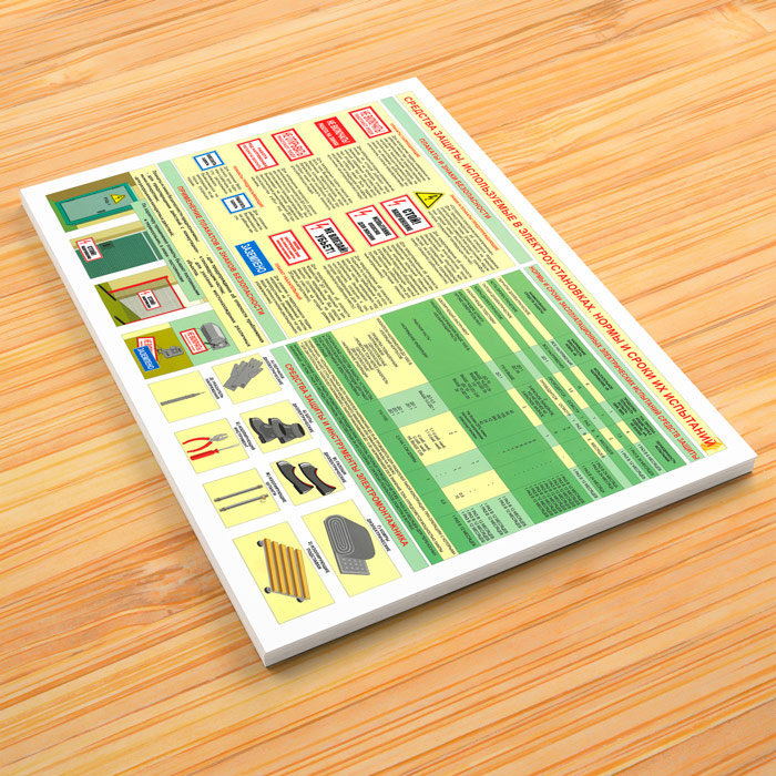 Плакат «Средства защиты, используемые в электроустановках. Нормы и сроки их испытаний» знакомит со средствами защиты от поражения электрическим током, используемыми в электроустановках. В плакате также приведены нормы и сроки испытаний средств защиты