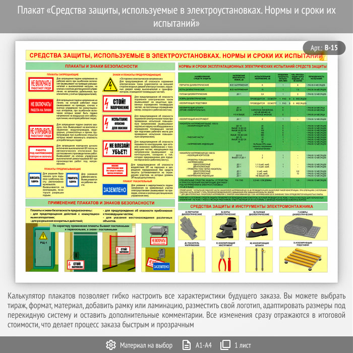 Плакат «Средства защиты, используемые в электроустановках. Нормы и сроки их испытаний» (В-15, 1 лист)