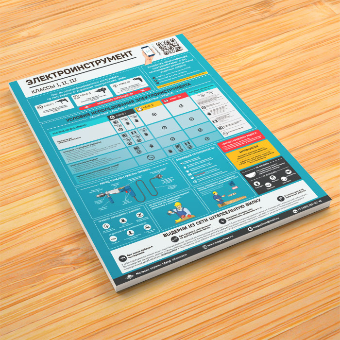 Плакат «Электроинструмент – электробезопасность» содержит такие важные темы как классы электрифицированного инструмента по типу защиты от поражения электрическим током, условия использования электроинструмента различных классов и электрозащитных средств, правила техники безопасности с электроинструментом