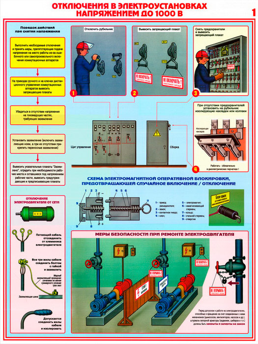 - Плакат «Отключения в электроустановках напряжением до 1000 В» – порядок действий, схема автоматической блокировки и меры безопасности при ремонте электродвигателя