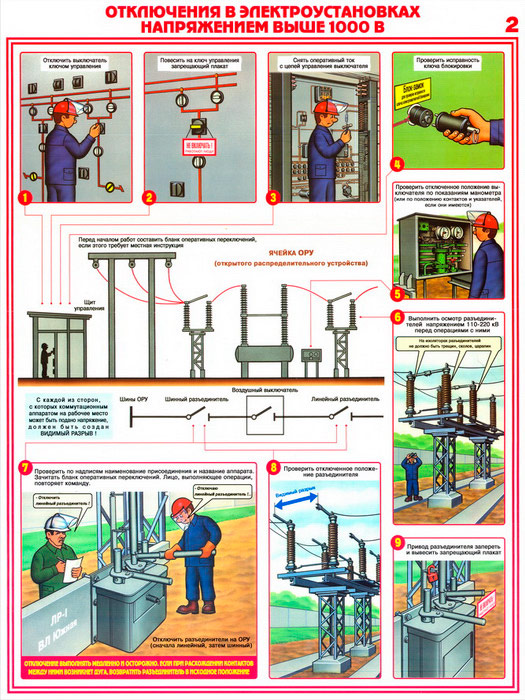 - Плакат «Отключения в электроустановках напряжением выше 1000 В» – порядок действий