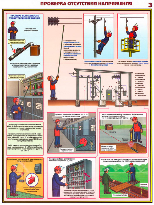 - Плакат «Проверка отсутствия напряжения» – исправность указателя и техника безопасности при проверке наличия электротока