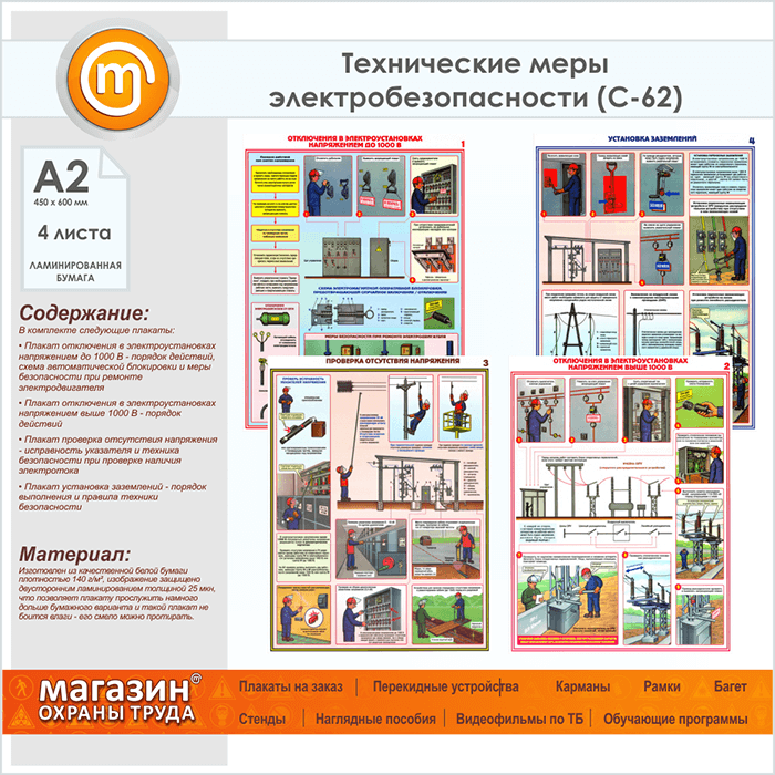Плакаты «Технические меры электробезопасности» (С-62, ламинированная бумага, А2, 4 листа)