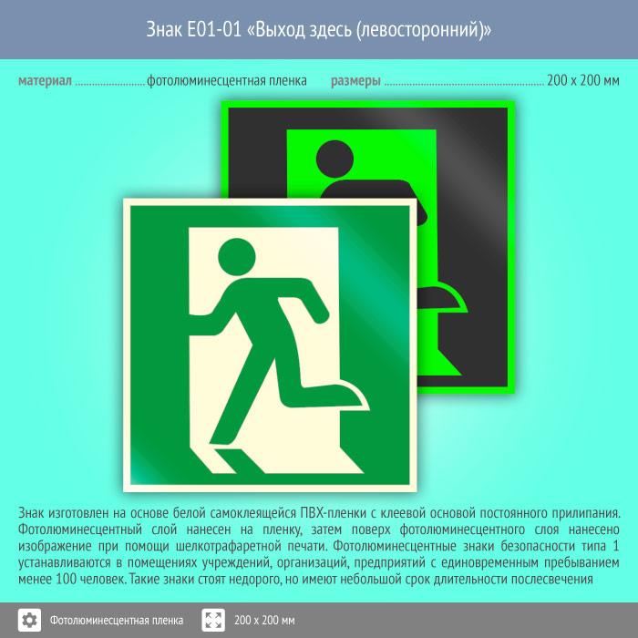 Знак E01-01 «Выход здесь (левосторонний)» на фотолюминесцентной пленке, размером 200х200 мм обозначает место выхода – слева. Эвакуационные знаки безопасности изготовлены согласно ГОСТ Р 12.4.026-2015 и предназначены для обозначения направления движения и выходов при эвакуации
