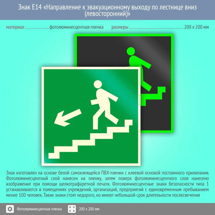Знак E14 «Направление к эвакуационному выходу по лестнице вниз (левосторонний)» на фотолюминесцентной пленке, размером 200х200 мм указывает направление к выходу вниз по лестнице влево. Эвакуационные знаки безопасности изготовлены согласно ГОСТ Р 12.4.026-2015 и предназначены для обозначения направления движения и выходов при эвакуации