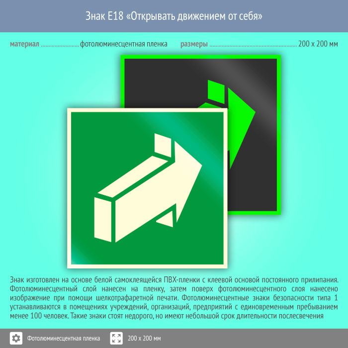 Знак E18 «Открывать движением от себя» на фотолюминесцентной пленке, размером 200х200 мм указывает направление движения – от себя во время эвакуации. Эвакуационные знаки безопасности изготовлены согласно ГОСТ Р 12.4.026-2015 и предназначены для обозначения направления движения и выходов при эвакуации