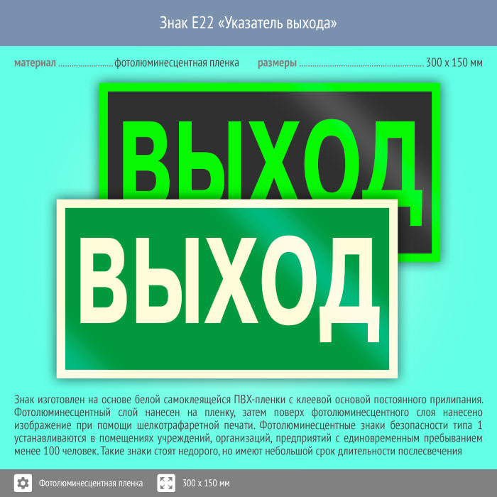 Знак E22 «Указатель выхода» (фотолюминесцентная пленка, 300х150 мм)