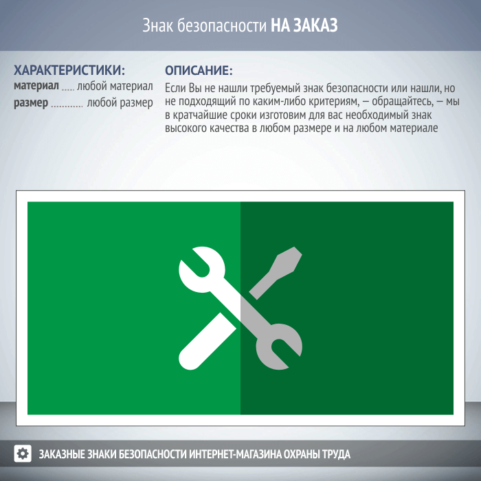 Если Вы не нашли нужный Вам эвакуационный знак безопасности или нашли, но неподходящий по каким-либо критериям, – обращайтесь, – мы в кратчайшие сроки изготовим для вас необходимый знак высокого качества в любом размере (от 1 см2 до 4 м2) и на любом материале