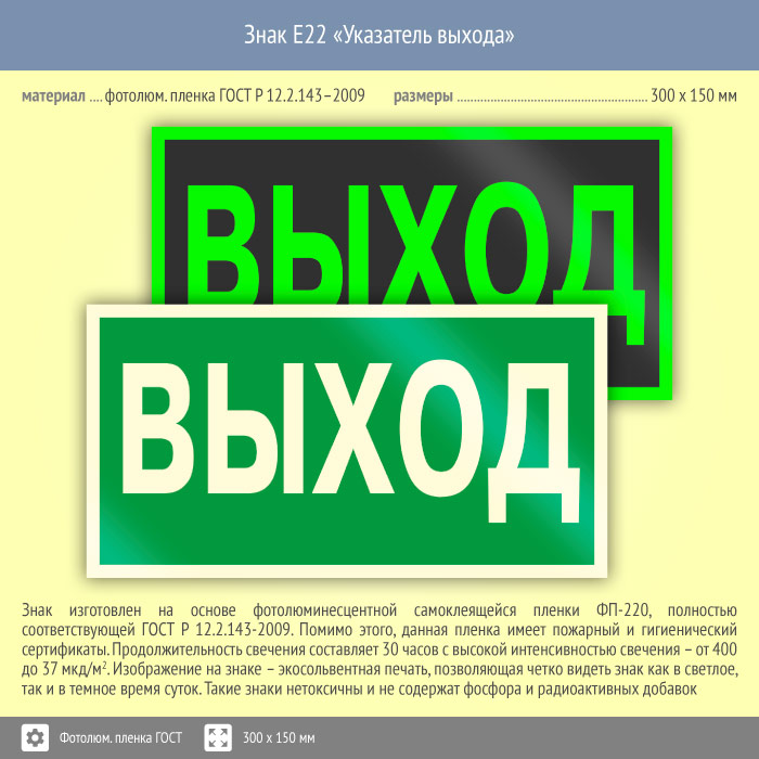 Знак E22 «Указатель выхода» на фотолюминесцентной пленке по ГОСТ 34428-2018, размером 300х150 мм обозначает выход – как во время эвакуации, так и в мирное время. Эвакуационные знаки безопасности изготовлены согласно ГОСТ Р 12.4.026-2015 и предназначены для обозначения направления движения и выходов при эвакуации