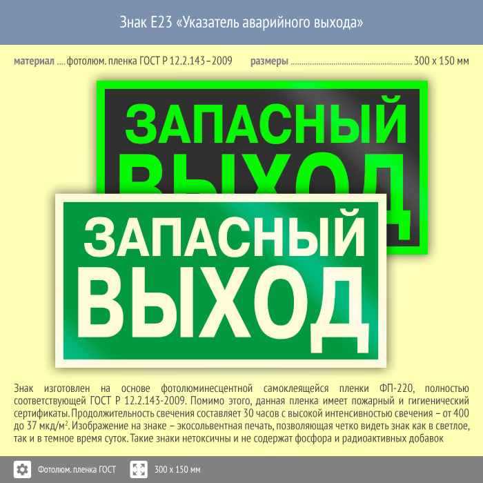 Знак E23 «Указатель запасного выхода» (устаревший) на фотолюминесцентной пленке по ГОСТ 34428-2018, размером 300х150 мм обозначает, что этот выход является запасным и используется только во время эвакуации. Эвакуационные знаки безопасности изготовлены согласно ГОСТ Р 12.4.026-2015 и предназначены для обозначения направления движения и выходов при эвакуации