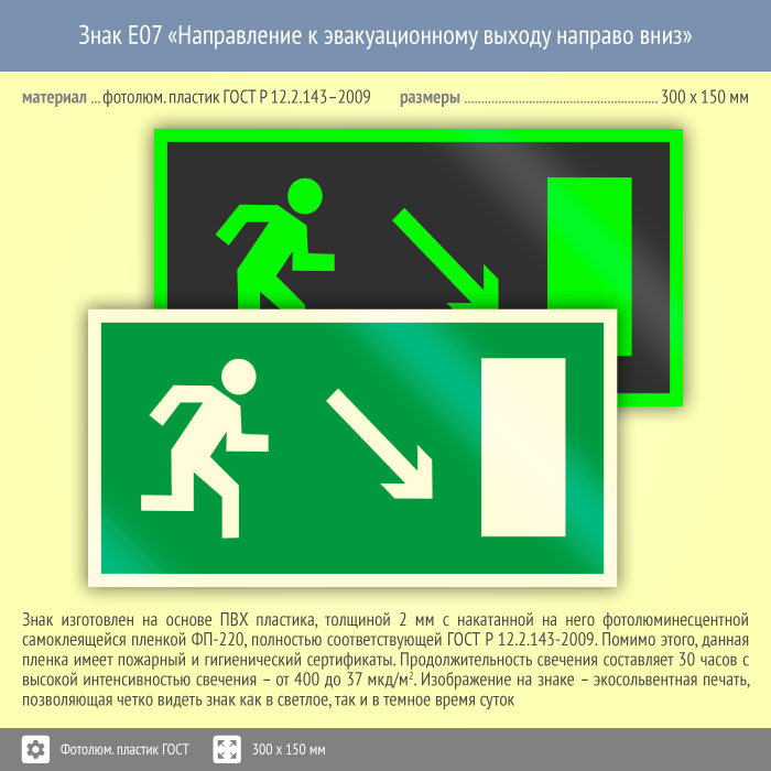 Знак E07 «Направление к эвакуационному выходу направо вниз» на фотолюминесцентном пластике по ГОСТ 34428-2018, размером 300х150 мм направляет к выходу направо и вниз. Эвакуационные знаки безопасности изготовлены согласно ГОСТ Р 12.4.026-2015 и предназначены для обозначения направления движения и выходов при эвакуации