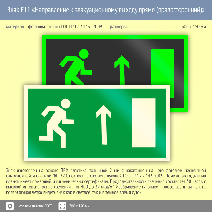 Знак E11 «Направление к эвакуационному выходу прямо (правосторонний)» на фотолюминесцентном пластике по ГОСТ 34428-2018, размером 300х150 мм указывает направление эвакуации – направо. Эвакуационные знаки безопасности изготовлены согласно ГОСТ Р 12.4.026-2015 и предназначены для обозначения направления движения и выходов при эвакуации