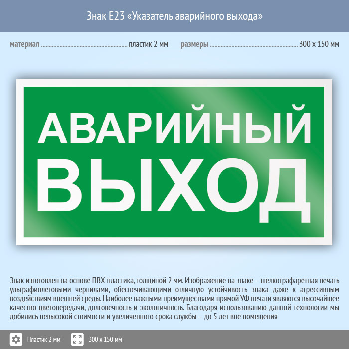 Знак E23 «Указатель аварийного выхода» на пластике, размером 300х150 мм обозначает, что этот выход является запасным и используется только во время эвакуации. Эвакуационные знаки безопасности изготовлены согласно ГОСТ Р 12.4.026-2015 и предназначены для обозначения направления движения и выходов при эвакуации