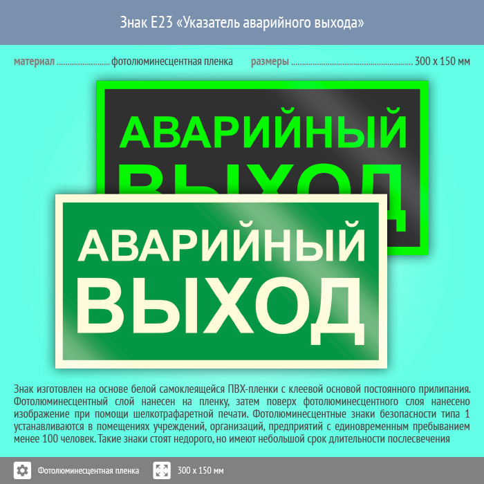 Знак E23 «Указатель аварийного выхода» на фотолюминесцентной пленке, размером 300х150 мм обозначает, что этот выход является запасным и используется только во время эвакуации. Эвакуационные знаки безопасности изготовлены согласно ГОСТ Р 12.4.026-2015 и предназначены для обозначения направления движения и выходов при эвакуации