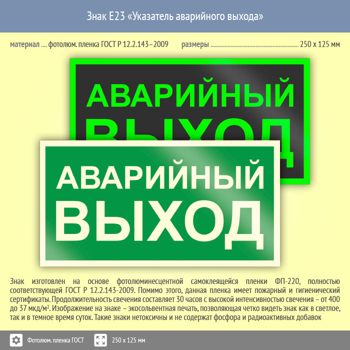 Знак E23 «Указатель аварийного выхода» на фотолюминесцентной пленке по ГОСТ 34428-2018, размером 250х125 мм обозначает, что этот выход является запасным и используется только во время эвакуации. Эвакуационные знаки безопасности изготовлены согласно ГОСТ Р 12.4.026-2015 и предназначены для обозначения направления движения и выходов при эвакуации