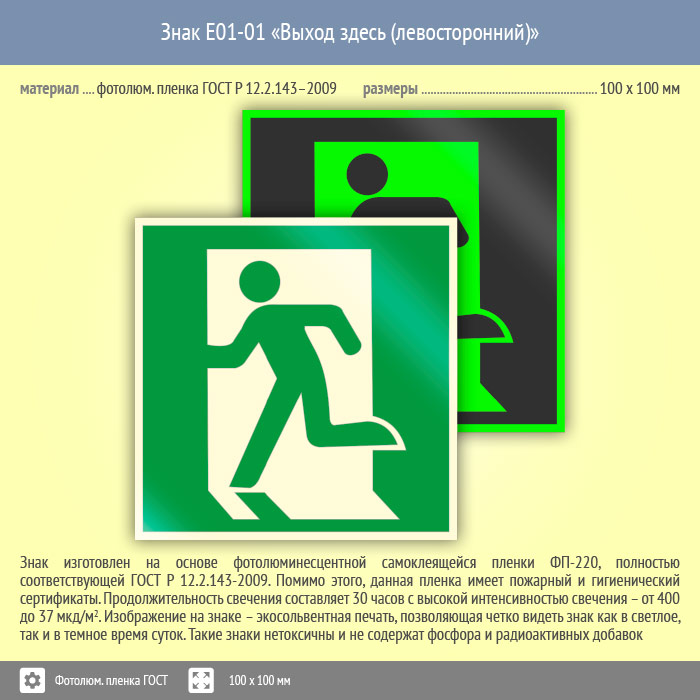 Знак E01-01 «Выход здесь (левосторонний)» на фотолюминесцентной пленке по ГОСТ 34428-2018, размером 100х100 мм обозначает место выхода – слева. Эвакуационные знаки безопасности изготовлены согласно ГОСТ Р 12.4.026-2015 и предназначены для обозначения направления движения и выходов при эвакуации