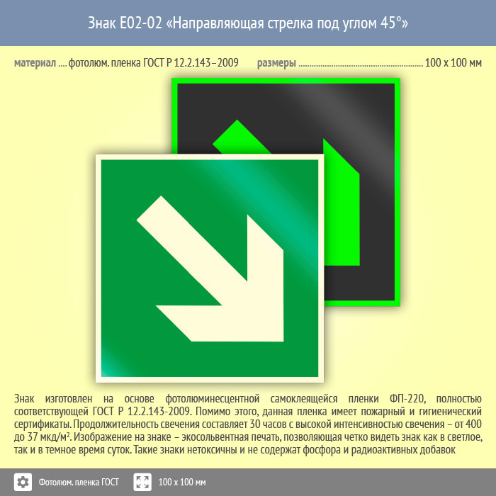 Знак E02-02 «Направляющая стрелка под углом 45°» на фотолюминесцентной пленке по ГОСТ 34428-2018, размером 100х100 мм обозначает направление эвакуации – вниз или наверх. Эвакуационные знаки безопасности изготовлены согласно ГОСТ Р 12.4.026-2015 и предназначены для обозначения направления движения и выходов при эвакуации