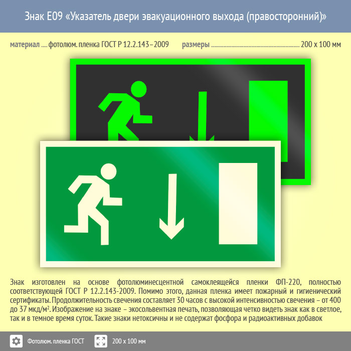 Знак E09 «Указатель двери эвакуационного выхода (правосторонний)» на фотолюминесцентной пленке по ГОСТ 34428-2018, размером 200х100 мм размещается над дверью эвакуационного выхода справа. Эвакуационные знаки безопасности изготовлены согласно ГОСТ Р 12.4.026-2015 и предназначены для обозначения направления движения и выходов при эвакуации