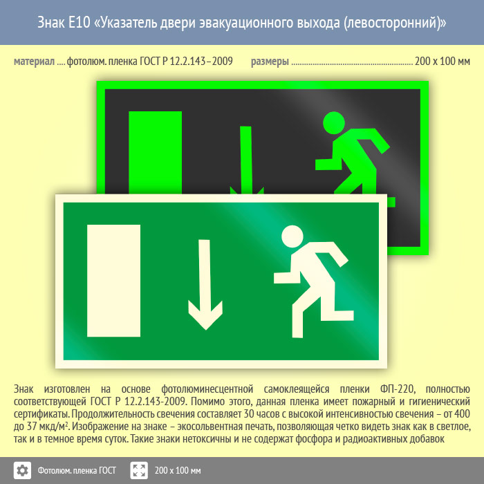 Знак E10 «Указатель двери эвакуационного выхода (левосторонний)» на фотолюминесцентной пленке по ГОСТ 34428-2018, размером 200х100 мм размещается над дверью эвакуационного выхода слева. Эвакуационные знаки безопасности изготовлены согласно ГОСТ Р 12.4.026-2015 и предназначены для обозначения направления движения и выходов при эвакуации