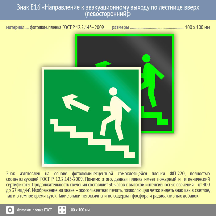 Знак E16 «Направление к эвакуационному выходу по лестнице вверх (левосторонний)» на фотолюминесцентной пленке по ГОСТ 34428-2018, размером 100х100 мм указывает направление к выходу вверх по лестнице влево. Эвакуационные знаки безопасности изготовлены согласно ГОСТ Р 12.4.026-2015 и предназначены для обозначения направления движения и выходов при эвакуации