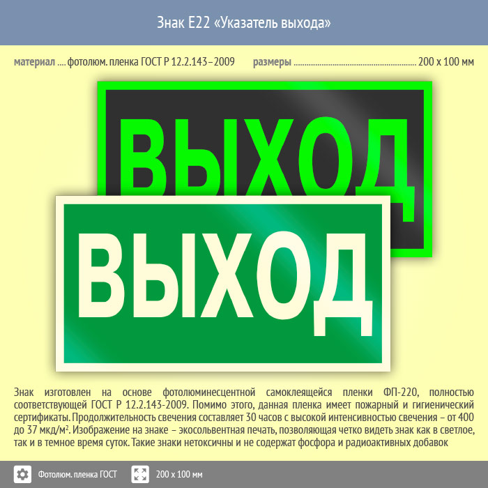 Знак E22 «Указатель выхода» на фотолюминесцентной пленке по ГОСТ 34428-2018, размером 200х100 мм обозначает выход – как во время эвакуации, так и в мирное время. Эвакуационные знаки безопасности изготовлены согласно ГОСТ Р 12.4.026-2015 и предназначены для обозначения направления движения и выходов при эвакуации