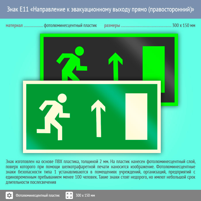 Знак E11 «Направление к эвакуационному выходу прямо (правосторонний)» на фотолюминесцентном пластике, размером 300х150 мм указывает направление эвакуации – направо. Эвакуационные знаки безопасности изготовлены согласно ГОСТ Р 12.4.026-2015 и предназначены для обозначения направления движения и выходов при эвакуации