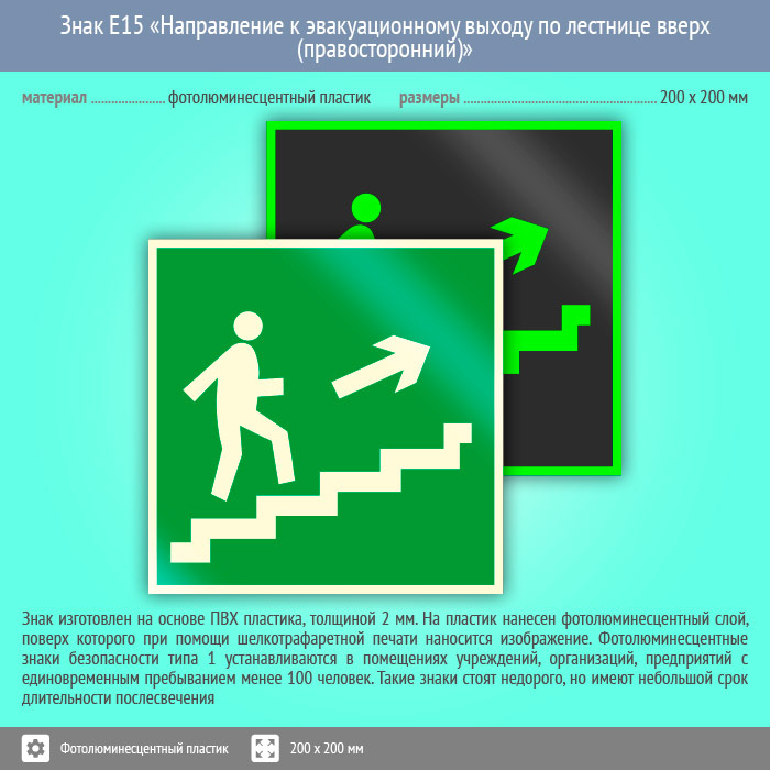 Знак E15 «Направление к эвакуационному выходу по лестнице вверх (правосторонний)» на фотолюминесцентном пластике, размером 200х200 мм указывает направление к выходу вверх по лестнице вправо. Эвакуационные знаки безопасности изготовлены согласно ГОСТ Р 12.4.026-2015 и предназначены для обозначения направления движения и выходов при эвакуации