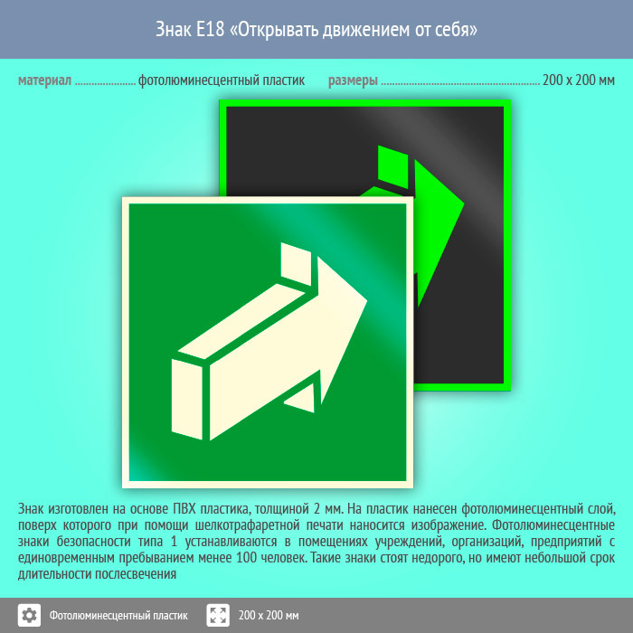 Знак E18 «Открывать движением от себя» на фотолюминесцентном пластике, размером 200х200 мм указывает направление движения – от себя во время эвакуации. Эвакуационные знаки безопасности изготовлены согласно ГОСТ Р 12.4.026-2015 и предназначены для обозначения направления движения и выходов при эвакуации