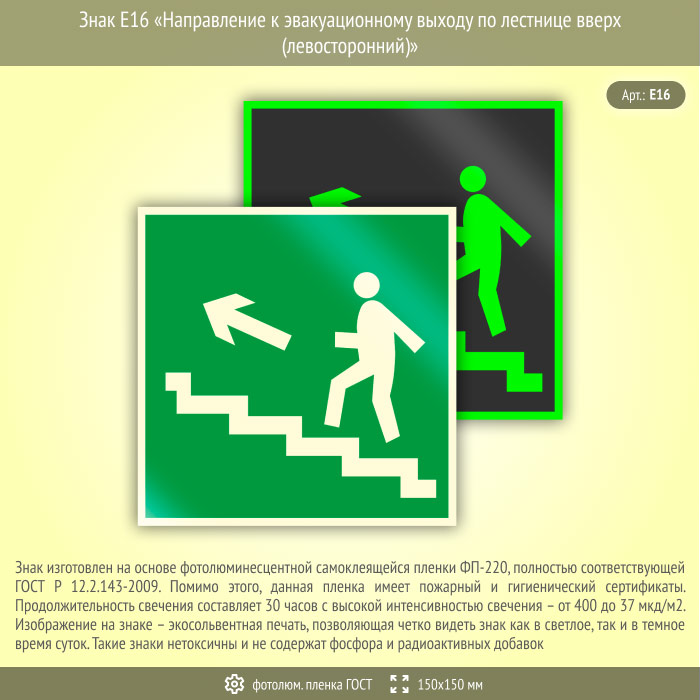 Знак E16 «Направление к эвакуационному выходу по лестнице вверх (левосторонний)» на фотолюминесцентной пленке по ГОСТ 34428-2018, размером 150х150 мм указывает направление к выходу вверх по лестнице влево. Эвакуационные знаки безопасности изготовлены согласно ГОСТ Р 12.4.026-2015 и предназначены для обозначения направления движения и выходов при эвакуации