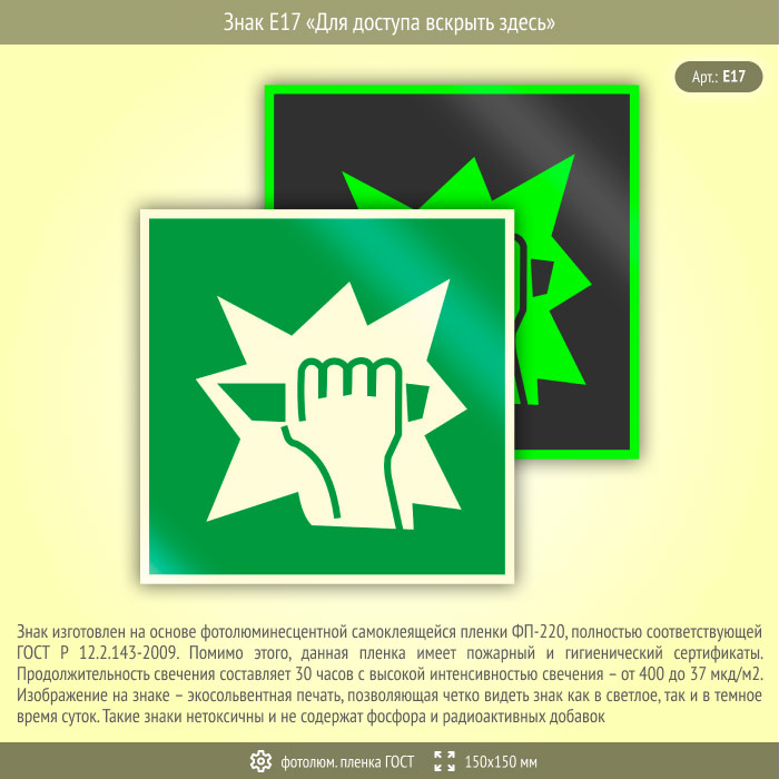 Знак E17 «Для доступа вскрыть здесь» на фотолюминесцентной пленке по ГОСТ 34428-2018, размером 150х150 мм рекомендует в случае эвакуации открыть. Эвакуационные знаки безопасности изготовлены согласно ГОСТ Р 12.4.026-2015 и предназначены для обозначения направления движения и выходов при эвакуации