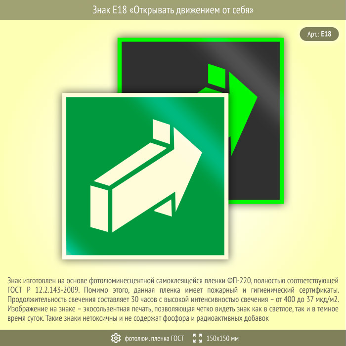 Знак E18 «Открывать движением от себя» на фотолюминесцентной пленке по ГОСТ 34428-2018, размером 150х150 мм указывает направление движения – от себя во время эвакуации. Эвакуационные знаки безопасности изготовлены согласно ГОСТ Р 12.4.026-2015 и предназначены для обозначения направления движения и выходов при эвакуации