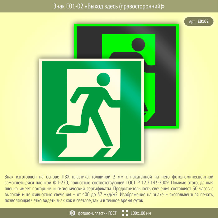 Знак E01-02 «Выход здесь (правосторонний)» на фотолюминесцентном пластике по ГОСТ 34428-2018, размером 100х100 мм обозначает место выхода – справа. Эвакуационные знаки безопасности изготовлены согласно ГОСТ Р 12.4.026-2015 и предназначены для обозначения направления движения и выходов при эвакуации02