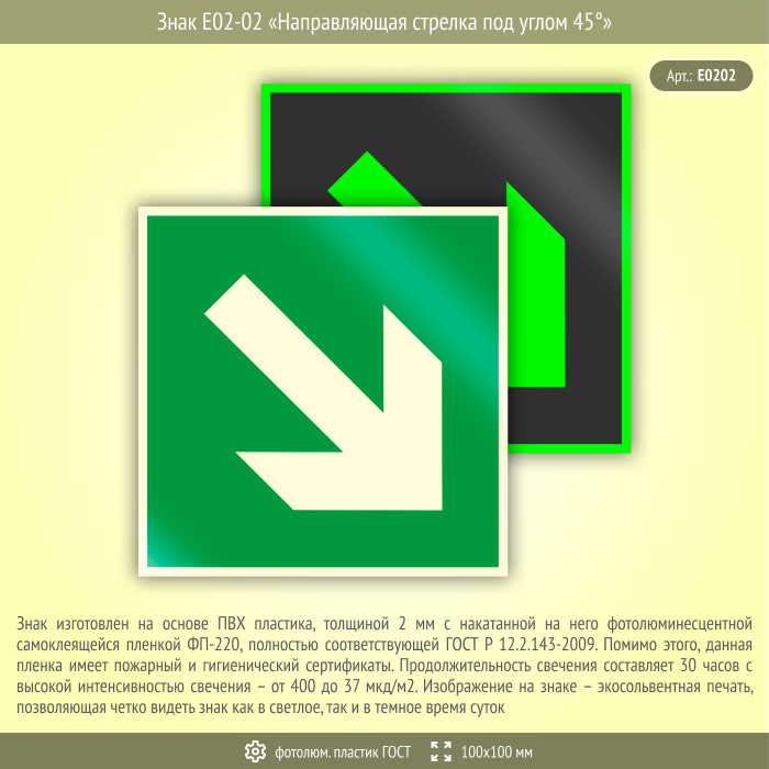 Знак E02-02 «Направляющая стрелка под углом 45°» на фотолюминесцентном пластике по ГОСТ 34428-2018, размером 100х100 мм обозначает направление эвакуации – вниз или наверх. Эвакуационные знаки безопасности изготовлены согласно ГОСТ Р 12.4.026-2015 и предназначены для обозначения направления движения и выходов при эвакуации