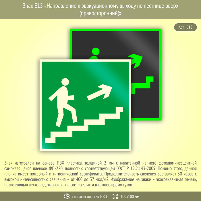 Знак E15 «Направление к эвакуационному выходу по лестнице вверх (правосторонний)» (фотолюминесцентный пластик ГОСТ 34428-2018, 100х100 мм)