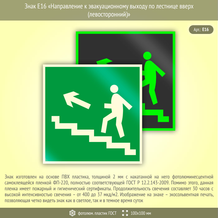 Знак E16 «Направление к эвакуационному выходу по лестнице вверх (левосторонний)» на фотолюминесцентном пластике по ГОСТ 34428-2018, размером 100х100 мм указывает направление к выходу вверх по лестнице влево. Эвакуационные знаки безопасности изготовлены согласно ГОСТ Р 12.4.026-2015 и предназначены для обозначения направления движения и выходов при эвакуации