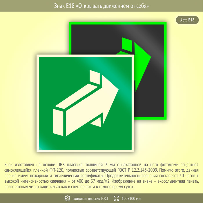 Знак E18 «Открывать движением от себя» на фотолюминесцентном пластике по ГОСТ 34428-2018, размером 100х100 мм указывает направление движения – от себя во время эвакуации. Эвакуационные знаки безопасности изготовлены согласно ГОСТ Р 12.4.026-2015 и предназначены для обозначения направления движения и выходов при эвакуации