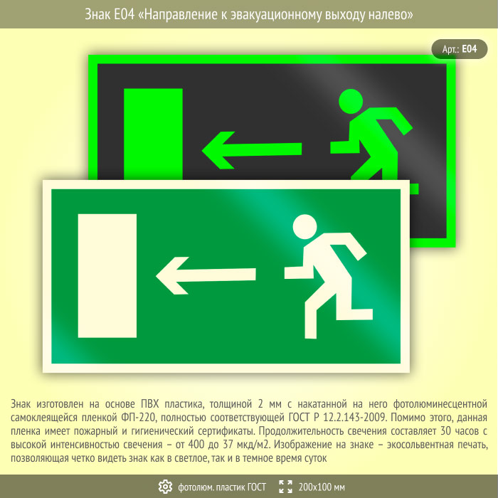 Знак E04 «Направление к эвакуационному выходу налево» на фотолюминесцентном пластике по ГОСТ 34428-2018, размером 200х100 мм обозначает направление эвакуации к выходу в левую сторону. Эвакуационные знаки безопасности изготовлены согласно ГОСТ Р 12.4.026-2015 и предназначены для обозначения направления движения и выходов при эвакуации