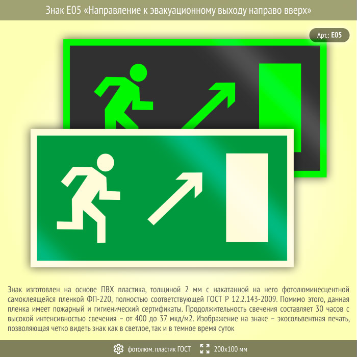 Знак E05 «Направление к эвакуационному выходу направо вверх» на фотолюминесцентном пластике по ГОСТ 34428-2018, размером 200х100 мм направляет к выходу направо и наверх. Эвакуационные знаки безопасности изготовлены согласно ГОСТ Р 12.4.026-2015 и предназначены для обозначения направления движения и выходов при эвакуации
