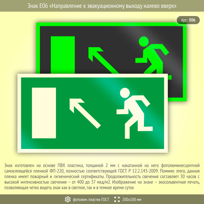 Знак E06 «Направление к эвакуационному выходу налево вверх» на фотолюминесцентном пластике по ГОСТ 34428-2018, размером 200х100 мм направляет к выходу налево и наверх. Эвакуационные знаки безопасности изготовлены согласно ГОСТ Р 12.4.026-2015 и предназначены для обозначения направления движения и выходов при эвакуации