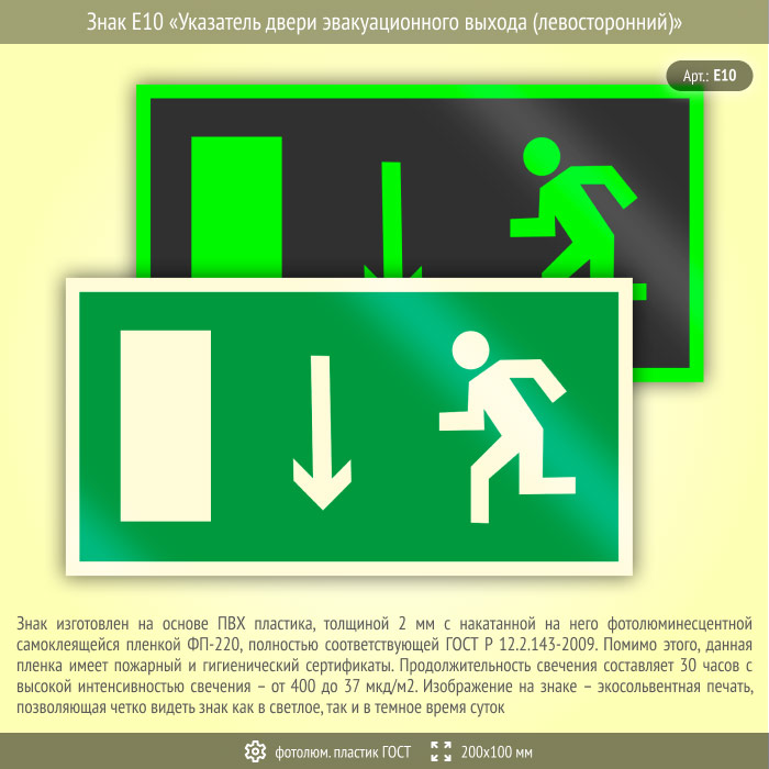 Знак E10 «Указатель двери эвакуационного выхода (левосторонний)» на фотолюминесцентном пластике по ГОСТ 34428-2018, размером 200х100 мм размещается над дверью эвакуационного выхода слева. Эвакуационные знаки безопасности изготовлены согласно ГОСТ Р 12.4.026-2015 и предназначены для обозначения направления движения и выходов при эвакуации