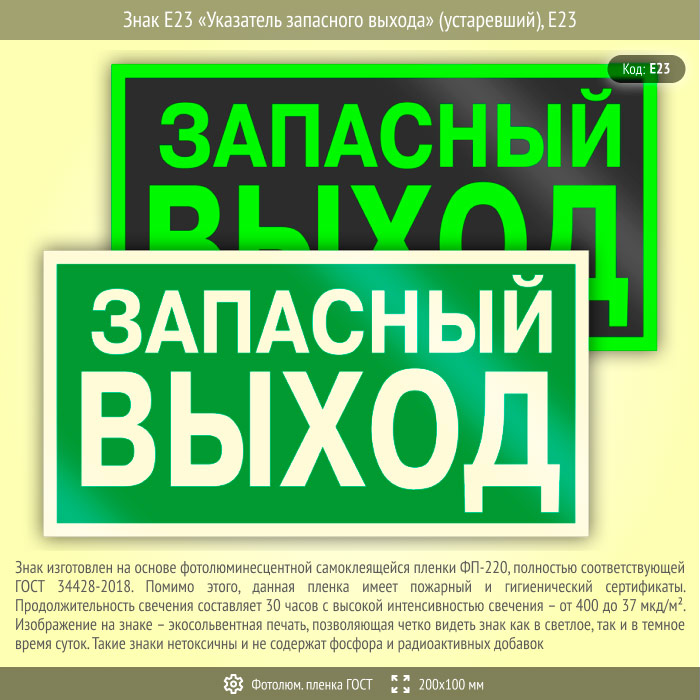 Знак E23 «Указатель запасного выхода» (устаревший) на фотолюминесцентной пленке по ГОСТ 34428-2018, размером 200х100 мм обозначает, что этот выход является запасным и используется только во время эвакуации. Эвакуационные знаки безопасности изготовлены согласно ГОСТ Р 12.4.026-2015 и предназначены для обозначения направления движения и выходов при эвакуации
